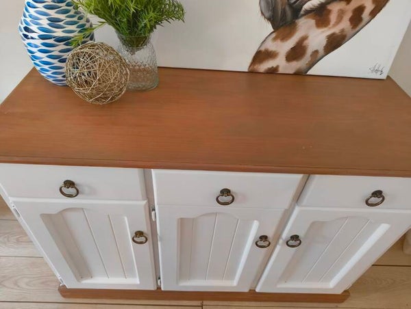 Bring a touch of warmth and timeless charm into your home with this beautifully refinished buffet. The piece has been lovingly restored in a fresh, soft white paired with a natural timber top and base for that classic, country-coastal feel.